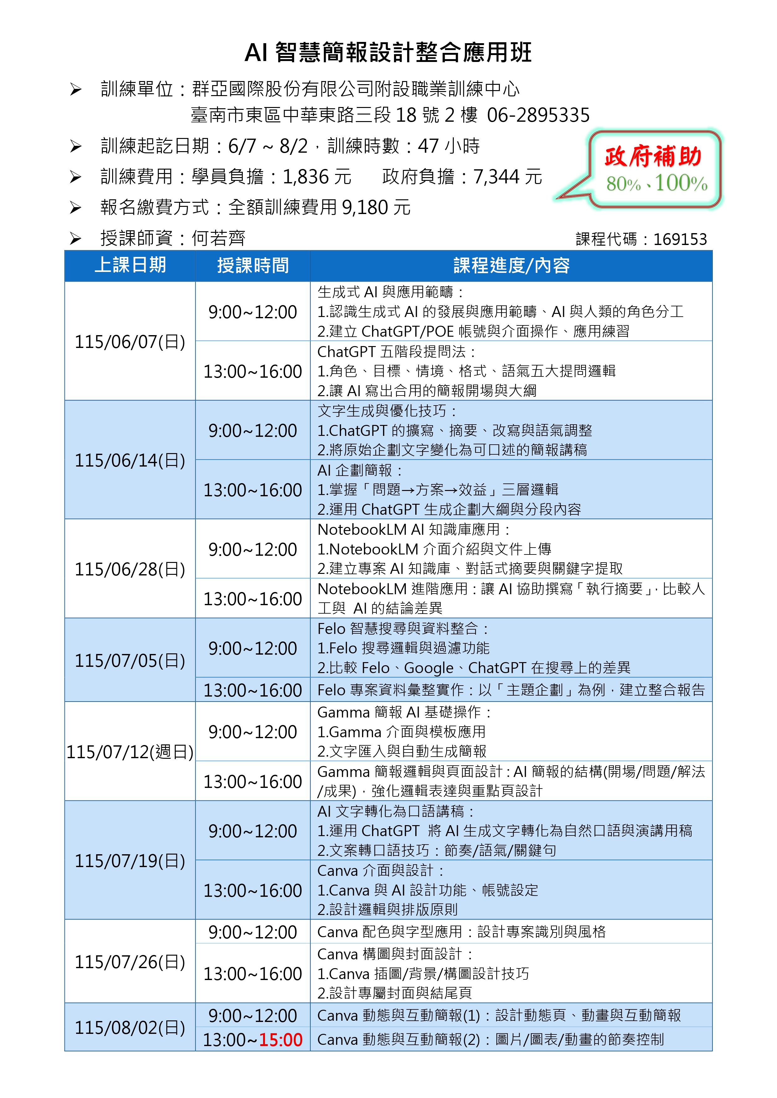 1.掌握從「資料蒐集 → 文案生成 → 簡報設計 → 口語呈現」的完整AI整合流程,能以AI工具輔助完成企劃簡報內容、視覺設計與口語講稿撰寫,顯著提升報告與提案品質。